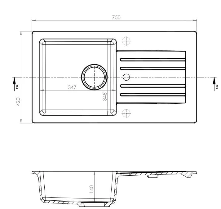 - afmetingen van de spoelbak 347 x 348 x 140 mm
