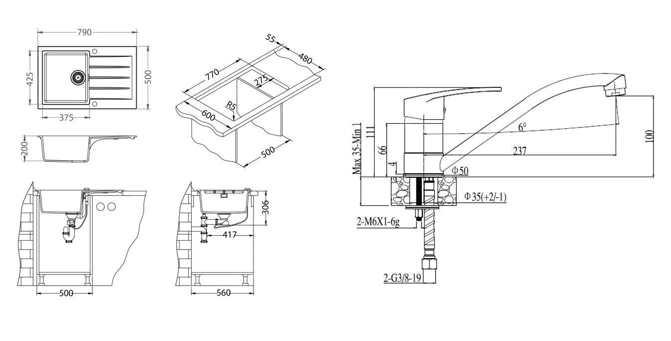 Set keukenspoelbak Cadit 20 met afvoerregeling en kraan Nina