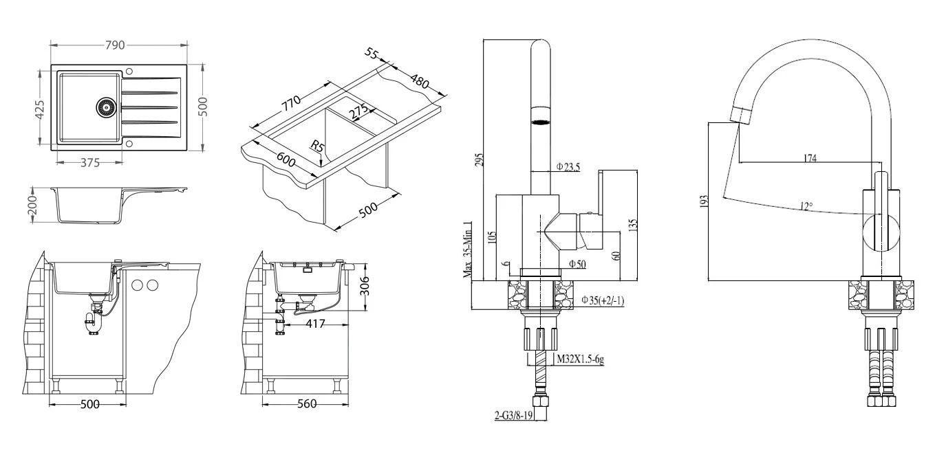 Set keukenspoelbak Cadit 20 met afvoerregeling en kraan Tonia