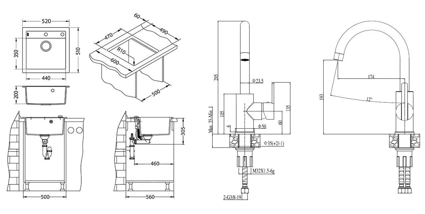 - afmetingen van de spoelbak 440 x 350 x 200 mm