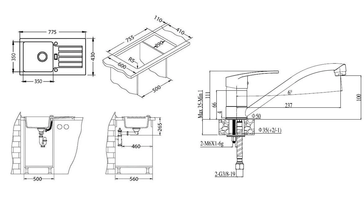 - afmetingen van de spoelbak 350 x 350 x 160 mm