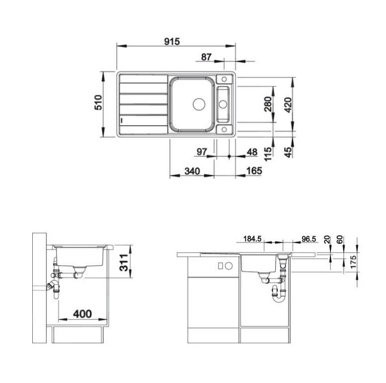 - totale afmeting van de spoelbak: 915 x 510 mm