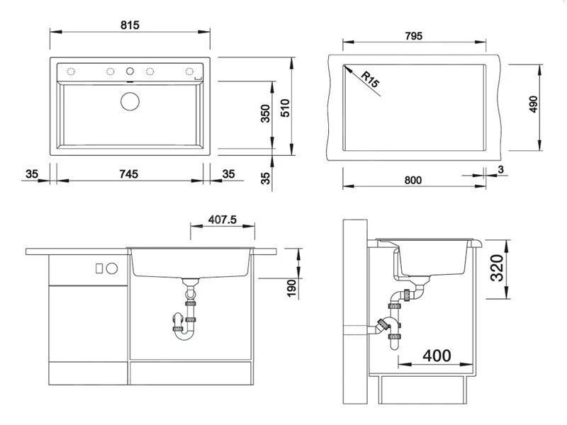 - totale afmeting van de spoelbak: 815 x 510 mm