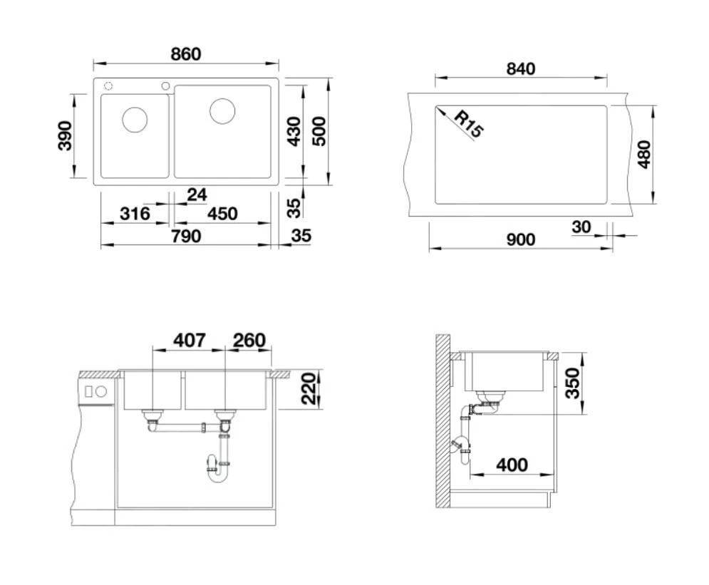 - totale afmeting van de spoelbak: 860 x 500 mm