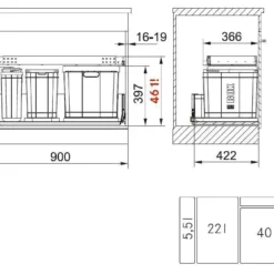 De afvalemmers uit 350, Trolley Vario en Easysort serie worden geplaatst in een behuizing met uittrekmechanisme. De behuizing is voorzien van een reling en hoge zijwand. Voor deze afvalemmers raden wij de volledig uittrekbare systemen Blum, Grass of Hettich aan.