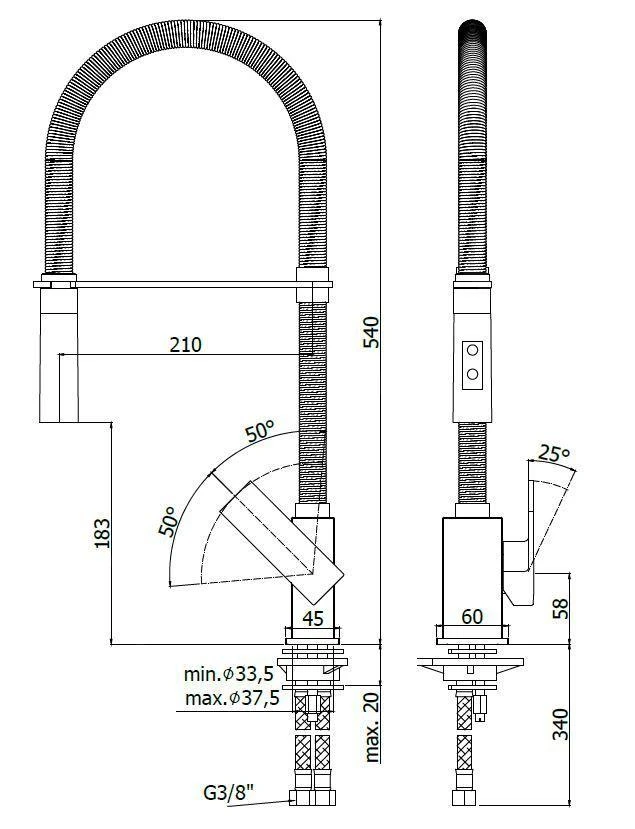 - set van 2 roestvrijstalen slangen G 3/8″ voor aansluiting op hoekstopkranen met een lengte van 35 cm